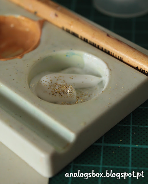 Foi a primeira trapalhada. Fiz por não me sentir afectada e evitei correr para a papelaria mais próxima para comprar os cadernos do tamanho indicado. É que gosto de ter páginas maiorzitas para me mexer, mas decidi que se calhar não era um mau primeiro passo para testar a brincadeira de recomeçar a escrever e desenhar livremente. Talvez estes fossem ainda mais descomprometidos do que os cadernos A5. E então resolvi por uma ideia em prática que estava já a magicar quando os encomendei... Decorar as capas à minha maneira. Andava cheia de vontade de criar capas personalizadas e tinha algum material novo que me apetecia muito testar. Tinta dourada, glitter dourado (quase em pó), e tinta transparente. Faltava-me fita-cola que não estragasse o papel, mas como tinha esta fita de papel em casa achei que não iria fazer muito mal. E então comecei a brincadeira...